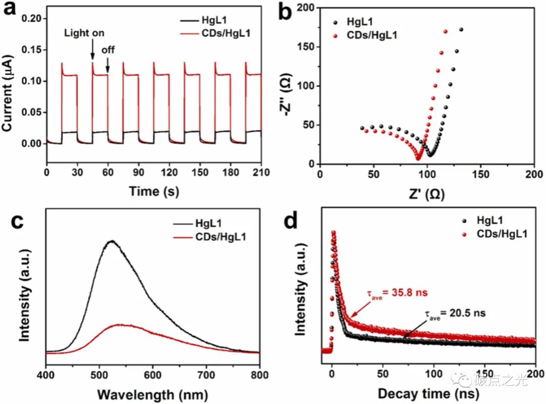 图3. (a) HgL1和CDs/HgL1在0.1 M Na2SO4溶液中的TPR和EIS。(c) HgL1和CDs/HgL1复合物的PL光谱和(d) TRPL光谱。