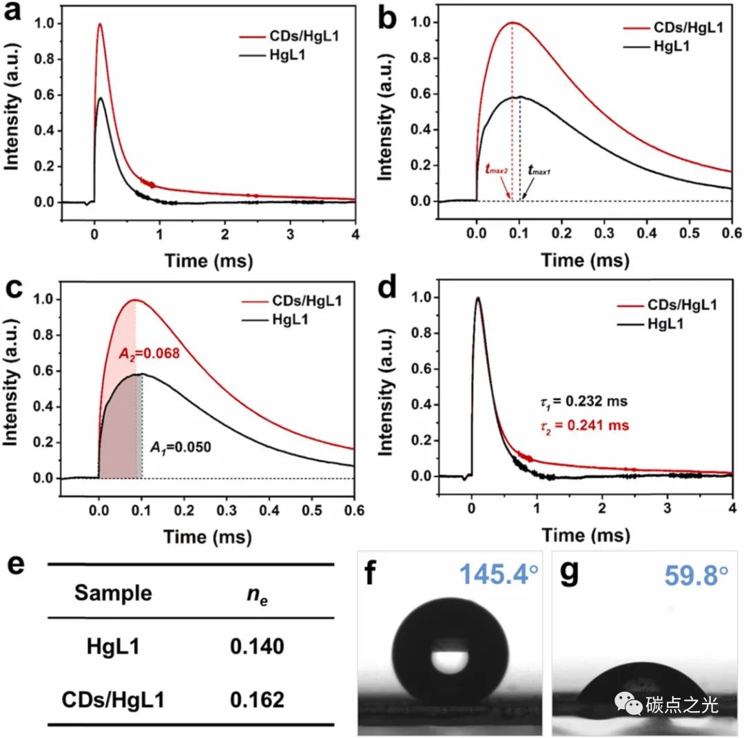 图4. 原始HgL1和CDs/HgL1的(a)TPV曲线,(b)最大电荷提取率(tmax),(c)最大电荷提取效率(a)和(d)电子衰减常数(τ)。(e)计算表面有效电子数(ne=A*T/tmax)。(f)原始HgL1和(g)CDs/HgL1的接触角。