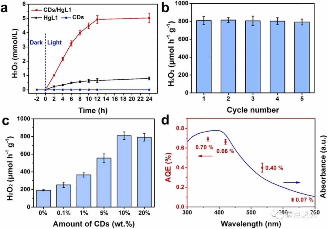 图5。(a) CDs、原始HgL1和CDs/HgL1催化H2O2生成的时间函数。(b) CDs/HgL1的循环稳定性。(c)不同CDs含量光催化剂产H2O2效率的比较。(d) AQE值与CDs/HgL1的UV-vis光谱。