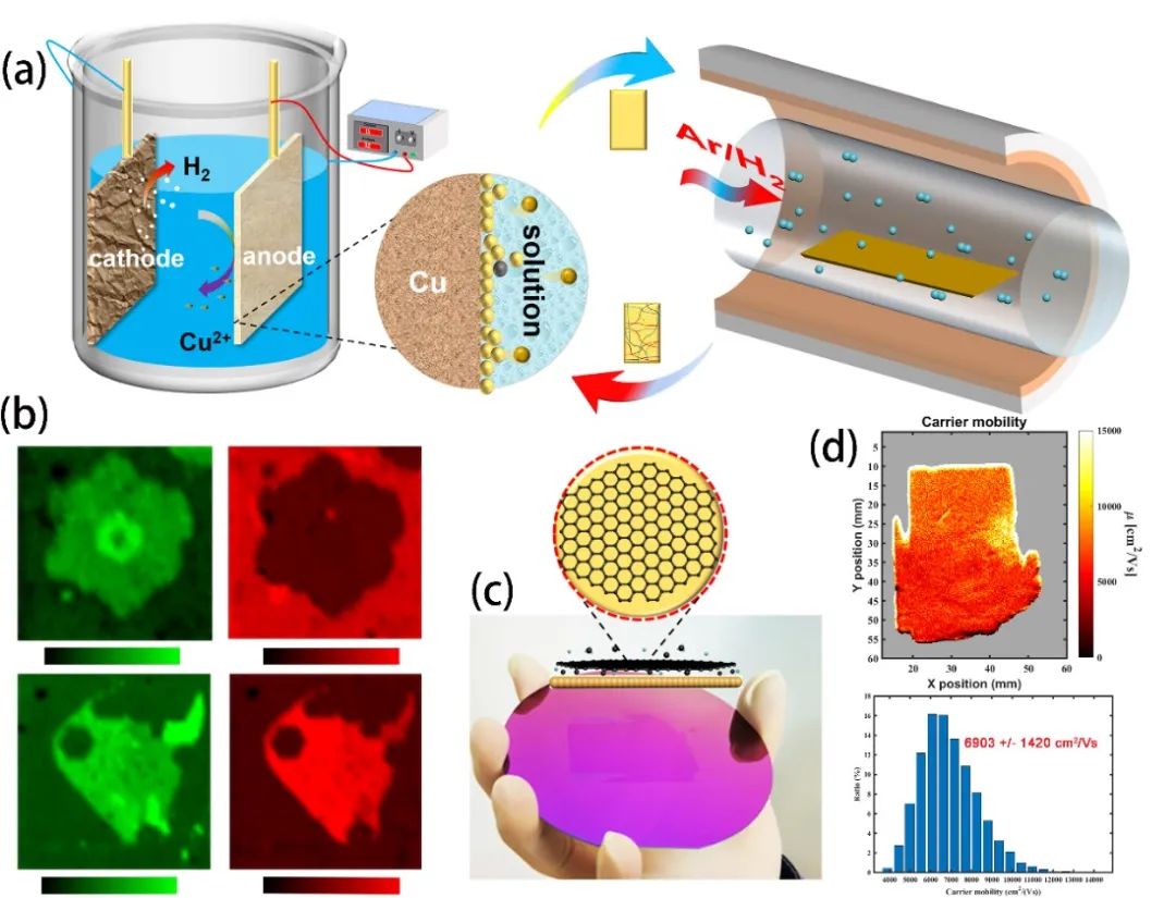 图1. (a)循环抛光退火示意图;(b)选择刻蚀样品拉曼面扫图;(c)转移到基底上的大面积纯单层石墨烯;(d)太赫兹时域光谱测试结果。