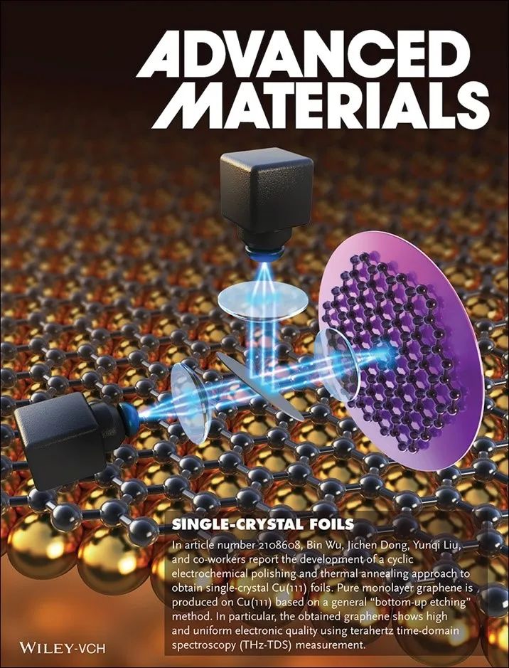 近期,该课题组开发了一种“循环电化学抛光结合高温退火”的方法,成功制备了大尺寸(4×32cm²)单晶Cu(111) 基底(图1),并对过程中晶粒长大与晶界演变相关机制进行了研究。Cu(111)晶面与石墨烯具有极低的晶格失配率,是石墨烯定向生长、无缝拼接成高质量薄膜的理想衬底之一。在此基础上,采用两步碳源浓度供给的“自下而上选择性刻蚀”策略成功制备了大面积单层单晶石墨烯(17cm²),所得实验结果与密度泛函理论(DFT)计算和相场模型模拟的选择性刻蚀过程吻合较好。此外,他们与丹麦科学技术大学Peter Boggild课题组合作,采用太赫兹时域光谱(THz-TDS)技术对石墨烯的电学性质及其均匀性进行表征,结果表明所得样品载流子迁移率较高且电学均匀性好,薄膜平均面电导率为2.8mS,大面积平均载流子迁移率为6903cm2V–1s–1。相关研究成果近期发表在Advanced Materials上(2022, 34, 2108608. DOI: 10.1002/adma.202108608),并被选为同期插页(图2)。该论文第一作者为中丹学院博士生姚文乾,共同第一作者为中丹学院硕士毕业生张家宁,通讯作者为武斌研究员、董际臣研究员和刘云圻院士。