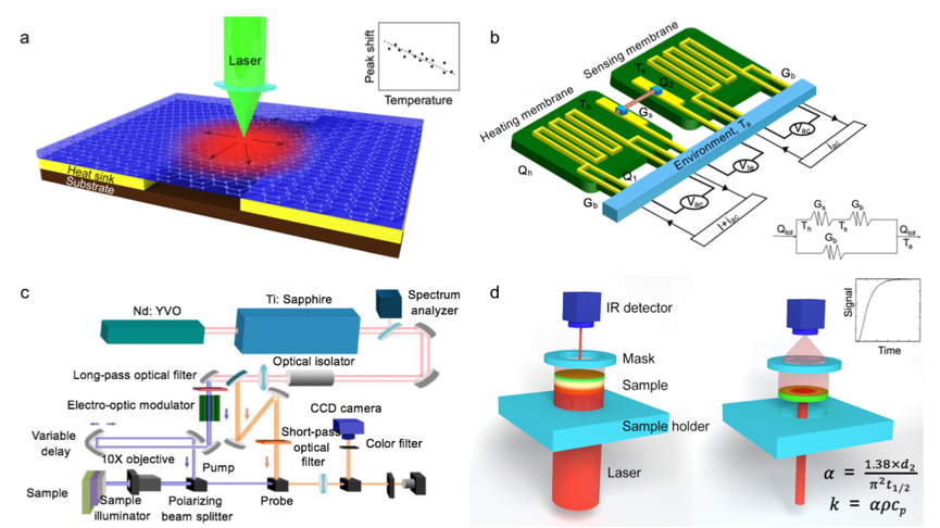 图1 常见热测量方法示意图。(a) 拉曼光谱法,(b) 悬空热桥法,(c) 时域热反射法 ,(d) 激光闪射法。