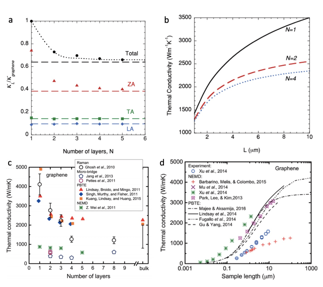 首先,是石墨烯高导热的声子学解释。2010年Lindsay提出ZA声子是单层石墨烯中热导率贡献最大的声子模,这一理论成功解释了单层石墨烯热导率高于石墨块体。而当考虑四声子散射时,ZA模声子的贡献又低于LA、TA。如何理解单原子层中的ZA声子振动、如何预测高阶声子散射对石墨烯热导的贡献,仍需要深入的理论计算提供支持。