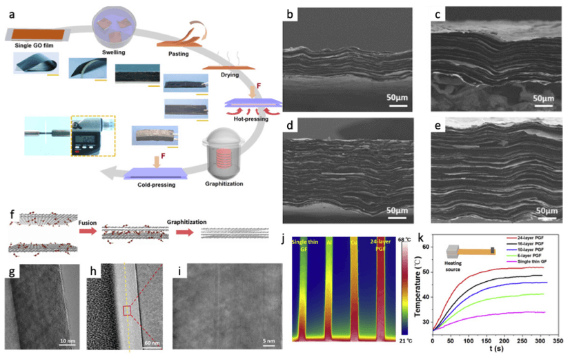 图3 百微米厚度石墨烯导热膜的制备、表征与热性能测试。