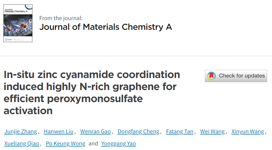 Junjie Zhang, et al. In-situ zinc cyanamide coordination induced highly N-rich graphene for efficient peroxymonosulfate activation, Journal of Materials Chemistry A,2022
