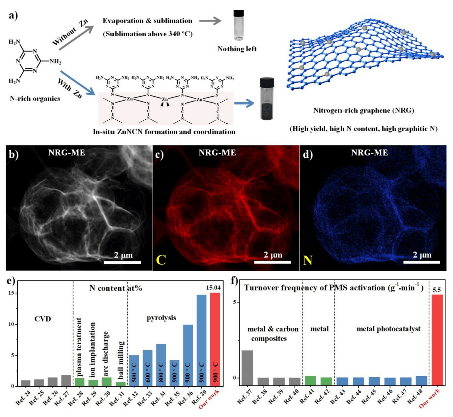 Fig. 1. a) Schematic illustration of the synthesis of NRG samples with/without ZnNCN formation and coordination. b) STEM image of NRG-ME with c-d) corresponding element mappings. e) Higher N content of as-obtained NRG than nitrogen-doped graphene prepared by other methods. f) Superior catalytic performance of NRG in PMS activation than most reported metal-based catalysts.