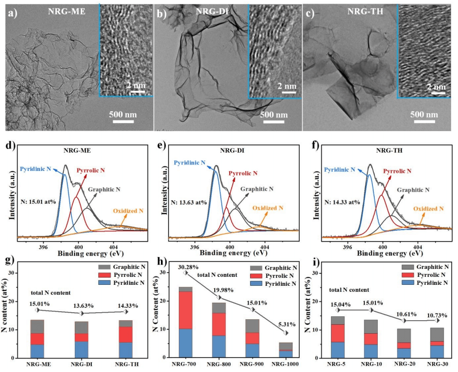 Fig. 2. TEM images of a) NRG-ME, b) NRG-DI and c) NRG-TH (insets are corresponding HRTEM images). High-resolution N 1s XPS spectra of d) NRG-ME, e) NRG-DI and f) NRG-TH samples. N contents of NRG prepared at different g) N-rich organics, h) temperature and i) ramp rate to demonstrate the versatility of ZnNCN coordination strategy and tunability of N configurations.