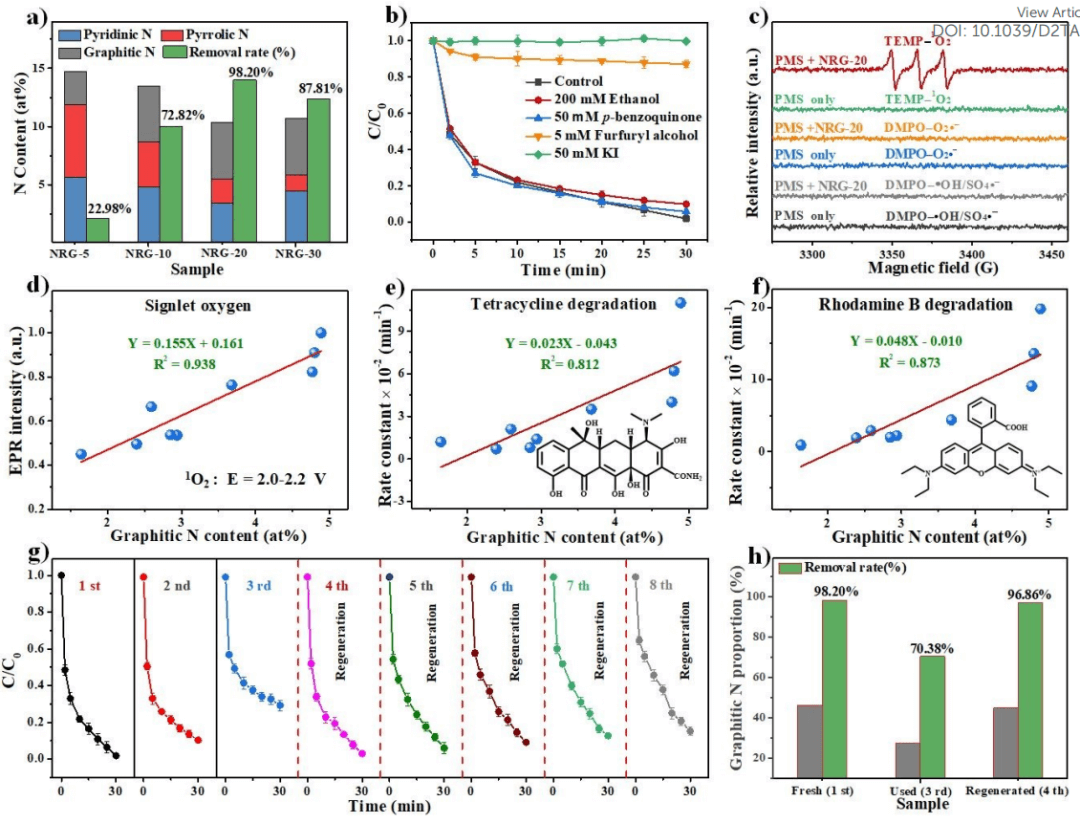 Fig. 3 a) Tetracycline removal rate and corresponding N content of different NRG samples (Condition: [PMS] = 0.2 mM, [tetracycline] = 20 mg/L, [NRG] = 20 mg/L). b) Effects of different scavengers on tetracycline degradation. c) EPR spectra of different reactive oxidative species. Graphitic N content versus d) EPR of TEMP-1O2, e) tetracycline degradation rate constant and f) Rhodamine B degradation rate constant. g) Reusability of NRG-20 for tetracycline degradation. (After the 3rd run, the recycled catalyst was thermally treated to regenerate the catalytic activity before each run). h) Comparison of tetracycline removal rate and graphitic N proportion in fresh, used, and regenerated NRG-20.