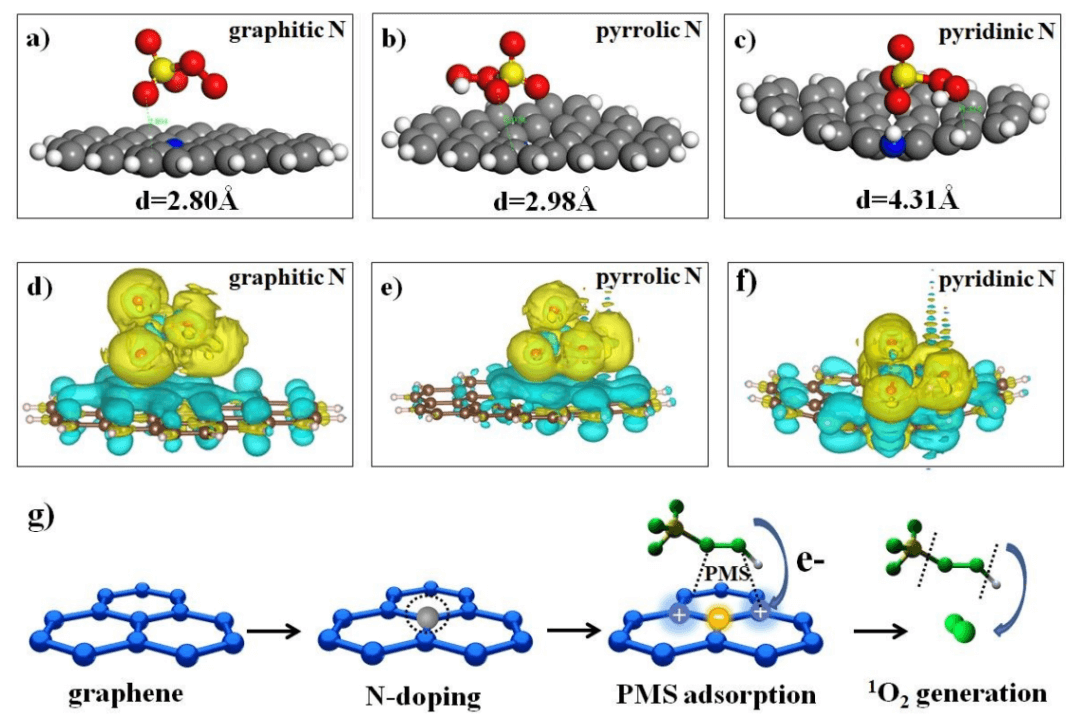 Fig. 4. a)-c) Optimized PMS configurations on different N-doped graphene (Distance between C and O atoms is marked below). d)-f) Charge density difference of different N-doped graphene. The light yellow and blue denote electron depletion and accumulation, respectively. g) Schematic illustration of the PMS activation mechanism.