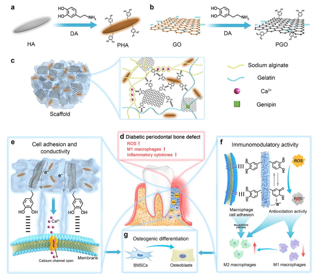 (a)PHA合成示意图。(b)PGO合成示意图。(c)物理化学双交联PGO-PHA-AG支架网络中的相互作用方式。(d)糖尿病牙周微环境中ROS、M1型巨噬细胞和炎性因子过度表达。(e)该支架促进细胞粘附,将内源性电信号传递给细胞,进而激活钙离子通道。(f)PDA的细胞粘附能力和ROS清除能力赋予支架免疫调节能力,降低巨噬细胞向M1型方向极化,促进巨噬细胞向M2型巨噬细胞方向极化并分泌成骨相关细胞因子。(g)支架的电活性和免疫调节能力协同促进糖尿病牙周骨缺损再生。
