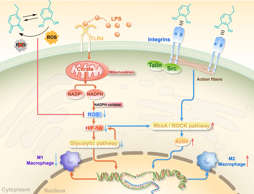 基于PDA介导的材料修饰手段和其生物学特性,近日,西南交通大学的鲁雄教授、谢超鸣研究员团队、四川大学的赵志河教授、王军教授团队,开发了一种包含PDA还原氧化石墨烯(PGO)和PDA修饰羟基磷灰石纳米颗粒(PHA)的仿贻贝多功能电活性海藻酸盐/明胶(AG)支架(图1a–c)。PHA和PGO NPs能够与高分子网络发生多重物理化学作用,赋予了支架良好的力学性能和导电性能;且PHA和PGO NPs为支架带来丰富的邻苯二酚基团,赋予支架良好的细胞粘附性。支架的电活性和细胞粘附性协同促BMSCs成骨分化(图1e)。邻苯二酚基团赋予支架的ROS清除能力和对巨噬细胞的粘附能力使支架具有免疫调节性能,通过减少M1型巨噬细胞,增加M2型巨噬细胞极化并分泌促成骨相关细胞因子促BMSCs成骨分化(图1f)。通过转录组测序探究支架调控巨噬细胞极化的机制,发现该支架调控巨噬细胞极化主要依赖于糖酵解通路和RhoA/ROCK信号通路(图2)。