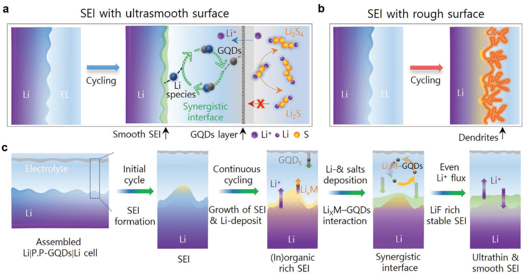 锂金属负极中枝晶的生长和不均匀固态电解质膜(SEI)的形成,阻碍了二次金属电池的长时间充放电循环和安全性。针对这一问题,近日,韩国庆尚大学Hyun Young Jung和仁荷大学Myung Gwan Hahm等人设计了一种新型的人造重构SEI膜。这种人造SEI膜由有机成分和富含无机成分的混合物组成并作为镶嵌界面,通过锂盐与羟基(-OH)化石墨烯量子点(GQDs)的协同效应,促进了均匀且超光滑的富氟(F)界面环境的形成,确保了锂离子的快速扩散和无枝晶特性。该文章发表在国际期刊Small上。