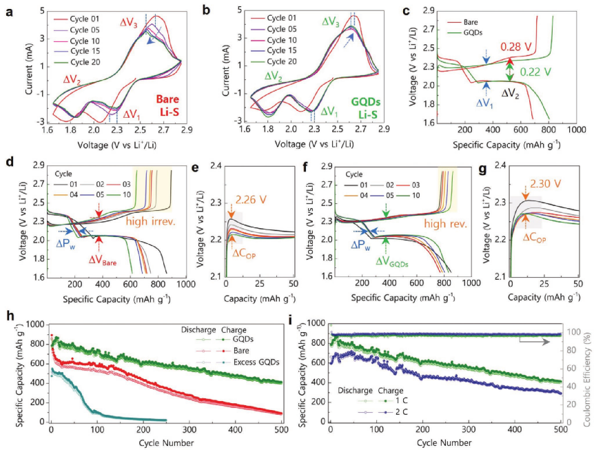 图2. GQDs/PP隔膜组装的Li-S电池的电化学性能。