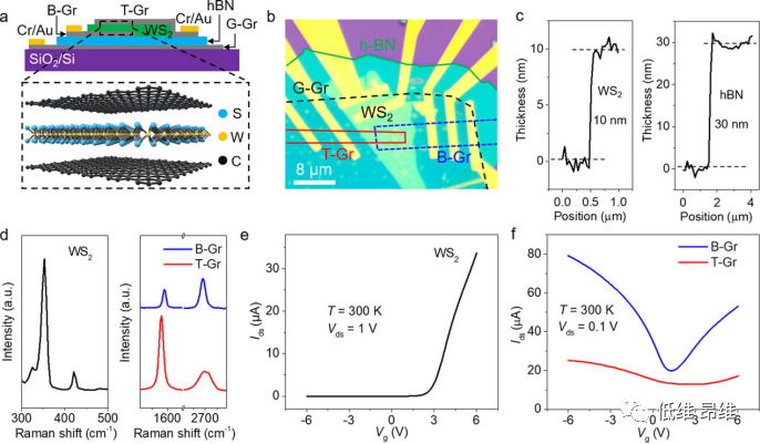 图1. GWG异质结隧穿晶体管的表征。(a)GWG隧穿器件的示意图。(b)光学显微镜图像。(c)WS2和hBN层的厚度为~10和~30 nm。(d)WS2、B-Gr和T-Gr的拉曼光谱。(e)WS2 FET在300 K时的转移曲线,显示出典型的n型半导体行为。(f)B-Gr和T-Gr在300 K时的转移曲线。