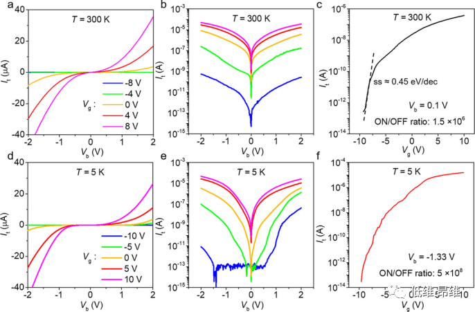 图2. GWG异质结隧穿晶体管中的隧穿输运测量。(a&b)300 K时不同Vg的It-Vb图。(c)固定Vb处的It-Vg图,显示300 K时的开/关比。(d&e)5 K时不同Vg的It-Vb图。(f)固定Vb处的It-Vg图,显示5 K时的开/关比。