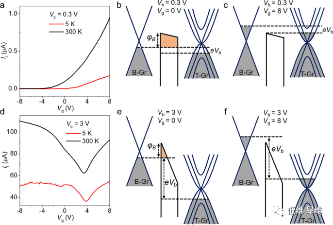 如图3a和d所示,转移曲线(由Vg引起的场效应)在小偏置区域(Vb=0.3 V)显示出典型的n型传导,但在较大偏置下切换到双极性传导(Vb=3 V)。图3b和c显示了GWG异质结在小偏置下的能带图。施加在顶部和底部石墨烯之间的小Vb会产生穿过WS2势垒的隧穿电流。由于底部双层石墨烯的弱屏蔽,穿过底部石墨烯的偏置感应电场略微改变了隧穿势垒的形状,形成了梯形隧穿势垒。