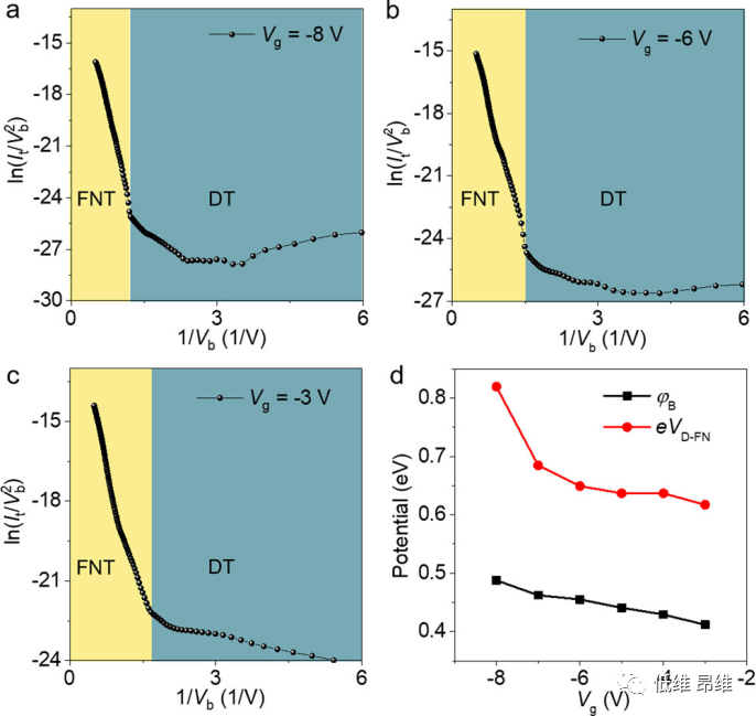 图4. GWG异质结隧穿晶体管中从直接隧穿到FN隧穿的交叉。(a-c)不同Vg下,GWG器件的ln(I/V2)与1/V曲线。(d)φB和VD-FN调制与Vg的关系。