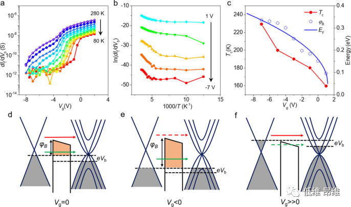 图5. GWG异质结隧穿晶体管温度相关的隧穿特性。(a)在280到80 K的各种温度下,零偏置微分电导dIt/dVb与Vg的关系。(b)不同Vg下零偏置微分电导的Arrhenius图。(c)提取的交叉温度Tc和势垒高度φB与Vg的关系。(d-f)GWG隧穿器件在小偏置和不同栅极电压下的能带图。