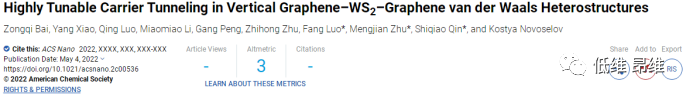 有鉴于此,近日,国防科技大学前沿交叉学科学院的秦石乔教授—朱梦剑研究员团队研制了基于垂直石墨烯-WS2-石墨烯范德华异质结的场效应隧穿晶体管,并且通过调控载流子隧穿性质有效提升了器件的综合性能。器件在室温下展现出低于0.1 pA的关态电流和超过106的高开/关比。此外,通过控制从直接隧穿区域到Fowler-Nordheim隧穿区域的过渡,器件的载流子输运极性可以有效地从较小偏压下的n型调节到较大偏压下的双极性特征。研究还发现异质结隧穿晶体管中的有效势垒高度可以通过栅极电压进行调控,载流子隧穿和热电子发射这两种机制都对器件在室温下的工作电流有贡献,从而显著提高了场效应隧穿晶体管的开态电流。研究成果以“Highly Tunable Carrier Tunneling in Vertical Graphene-WS2-Graphene van der Waals Heterostructures”为题发表在著名期刊ACS Nano(最新影响因子15.9)上,通讯作者为秦石乔教授、朱梦剑研究员和罗芳博士。