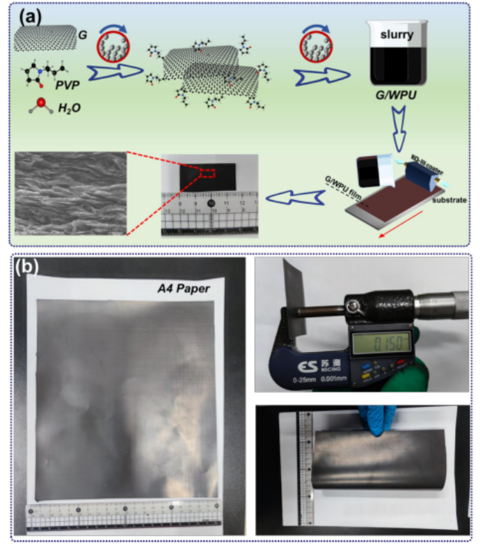 图1 (a)致密有序的G/WPU复合膜的制备过程示意图;(b)G/WPU薄膜的实物图