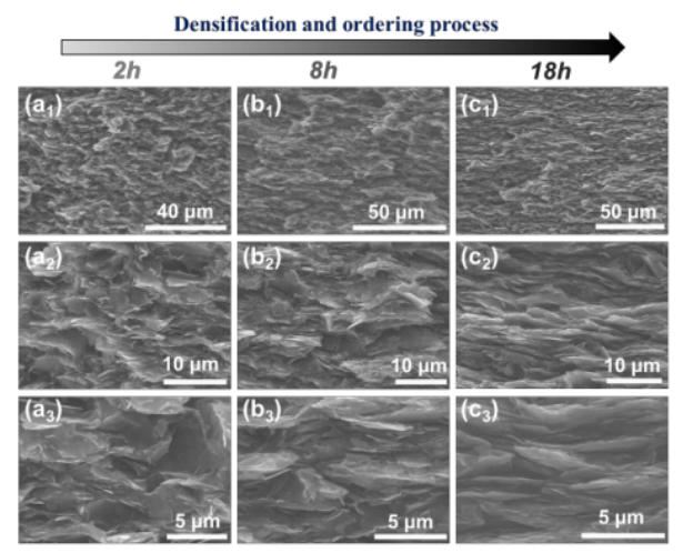 图2 不同球磨时间制备的G/WPU薄膜的形貌变化:2 h (a1-a3)、8 h (b1-b3)和18 h (c1-c3)制备的G/WPU薄膜的横截面SEM图像