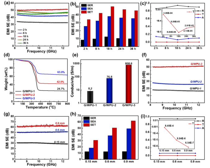 图3 (a)用不同球磨时间制备的G/WPU薄膜在X波段频率范围的电磁屏蔽性能。(b)X波段的平均SEA、SER和SET的概述;(c)G/WPU薄膜的反射率(R)、吸收率(A)和透射率(T)值的相应功率系数;具有不同石墨烯含量的G/WPU膜的TGA分析曲线(d)、电导率(e)和EMI SE (f );(G)不同厚度的G/WPU薄膜的电磁干扰SE;(h)总结不同厚度下的平均SEA、SER和SET;(i)不同厚度的G/WPU薄膜的R、A和T值的相应功率系数。