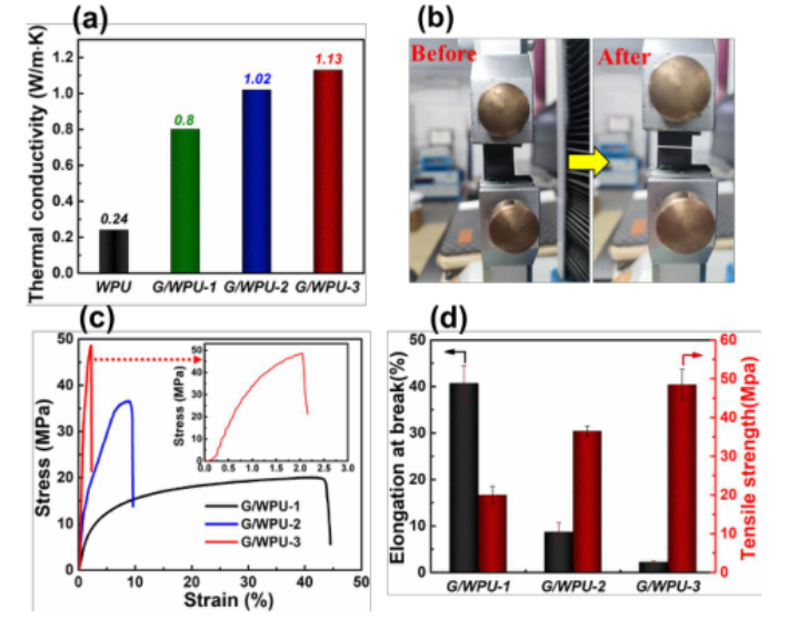 图4 (a)纯WPU膜和具有不同石墨烯含量的G/WPU膜的热导率;(b)分别处于拉伸和断裂状态的G/WPU膜的照片;不同石墨烯含量的G/WPU薄膜的拉伸应力-应变曲线(c)以及拉伸强度和弹性模量(d),(c)中的插图是G/WPU-3薄膜的拉伸曲线。