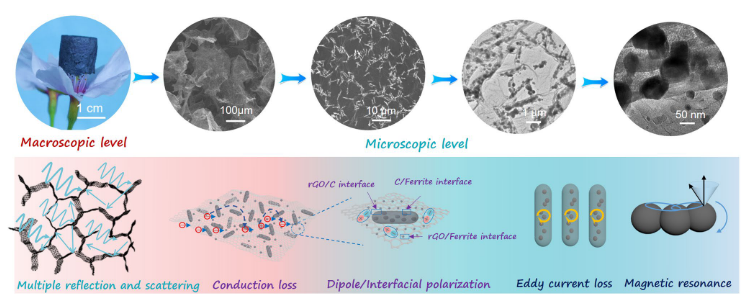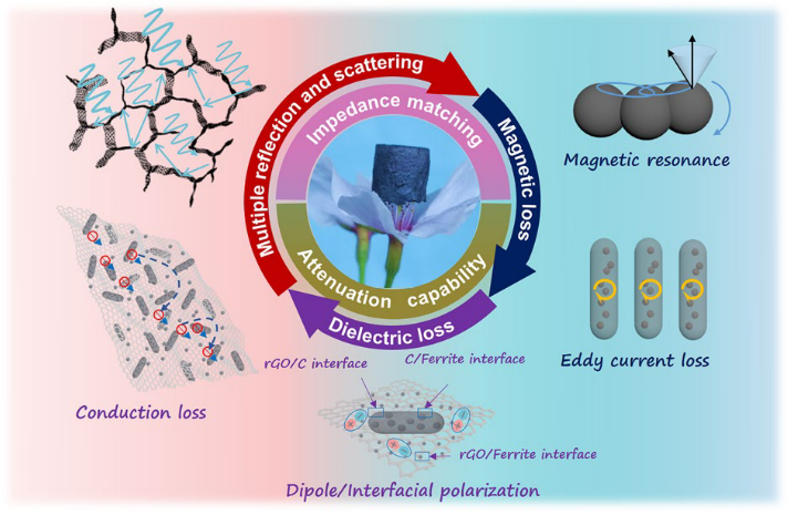 图7. MOF/rGO衍生磁-介电气凝胶的吸波机理示意图。