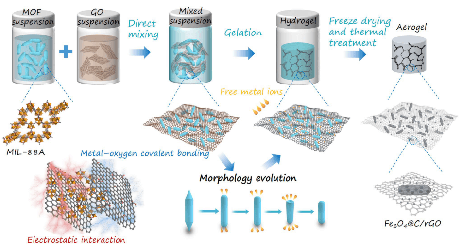 图1显示了三维MOF/rGO气凝胶及其衍生气凝胶的制备过程。GO水溶液和预合成的MOF (MIL-88A)晶体悬浮液在剧烈摇晃的条件下混合均匀。由于MIL-88A晶体表面的自由Fe³⁺和GO表面含氧官能团之间的金属-氧共价或静电相互作用,防止不溶性MIL-88A纳米棒在混合溶液中沉淀,从而提供了稳定的悬浮液。在适度的加热条件下,混合悬浮液即可凝胶,经过冷冻干燥得到MOF/rGO气凝胶,热处理后获得MOF/rGO衍生气凝胶。