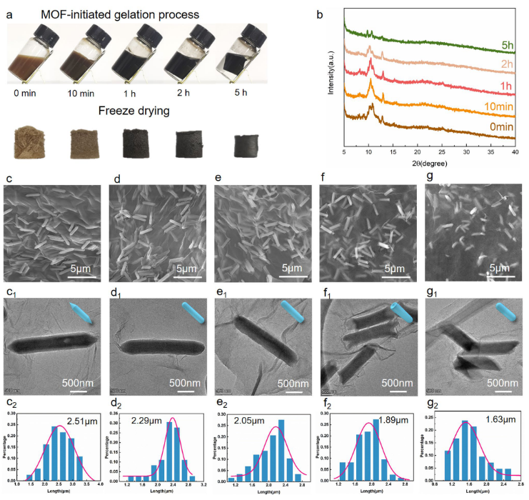 图2. 不同凝胶时间制备的MIL-88A/rGO气凝胶(a) 光学照片,(b) XRD图谱和(c-g) 基于SEM和TEM图像的尺寸分布统计图。