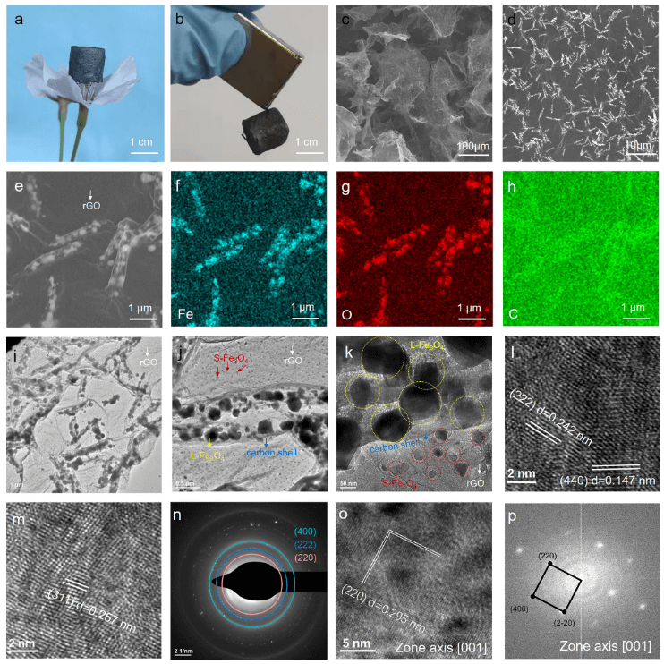 图3. Fe₃O₄@C/rGO气凝胶微观形貌及物相组成。