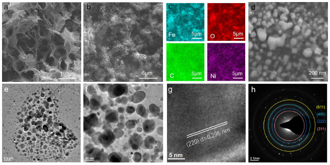 图4. Ni掺杂Fe₃O₄@C/rGO气凝胶微观形貌及物相组成。