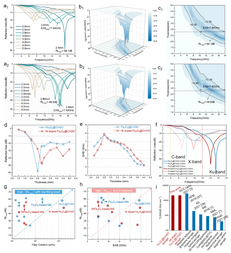 图5. Fe₃O₄@C/rGO和Ni掺杂Fe₃O₄@C/rGO气凝胶的微波吸收性能及其与报道材料性能对比。
