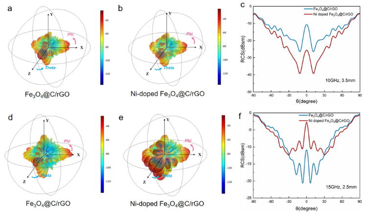 图6. Fe₃O₄@C/rGO和Ni掺杂Fe₃O₄@C/rGO气凝胶的三维雷达波散射信号及RCS模拟曲线图。