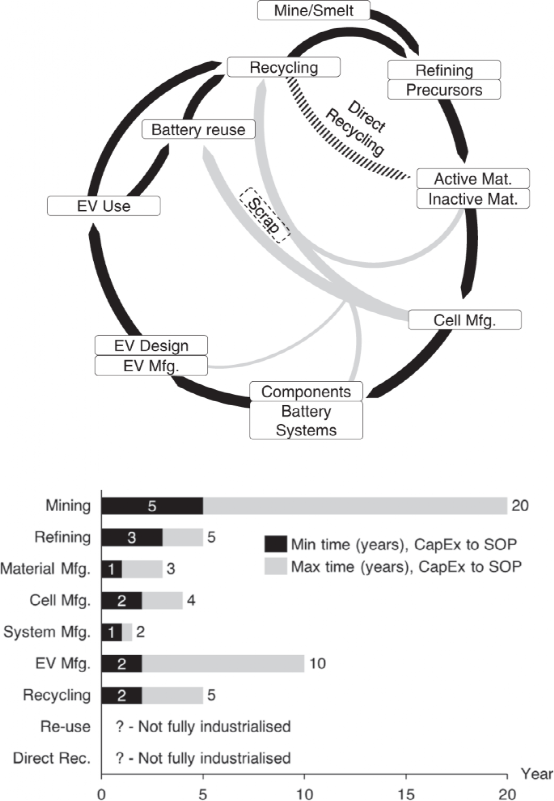 图7:循环电动车电池价值链,从矿物开采到回收(上),以及达到SOP所需的典型时间(下)。