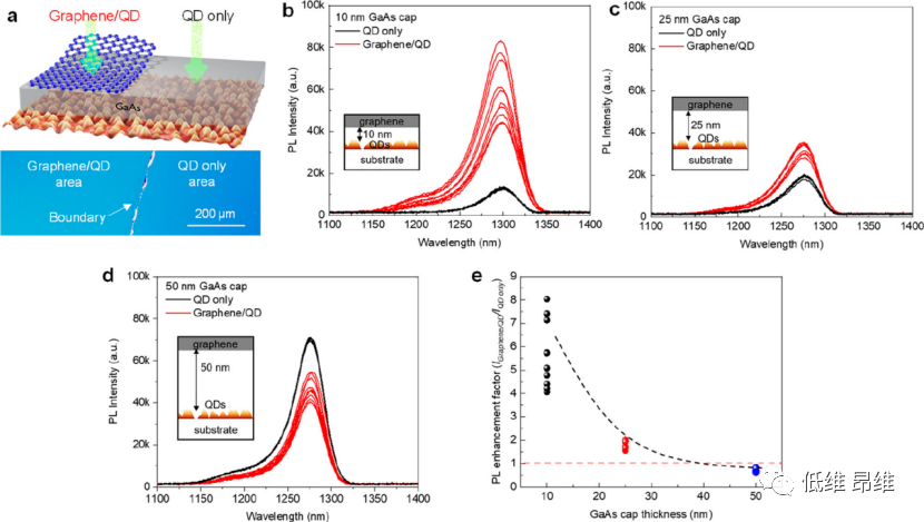 有鉴于此,近日,韩国科学技术研究院Daehwan Jung等展示了石墨烯/III-V量子点混维异质结的强光致发光增强。与仅量子点结构相比,2D/0D杂化结构中石墨烯与量子点之间的距离决定了辐射载流子复合增强的程度从80%到800%。当距离从50 nm减小到10 nm时,时间分辨的光致发光衰减也显示出载流子寿命增加。研究认为,量子点的光学增强是由于能量、弯曲和空穴载流子转移,它们修复了量子点中电子和空穴载流子密度的不平衡。这种2D石墨烯/0D量子点异质结显示出高性能纳米级光电器件的应用前景。