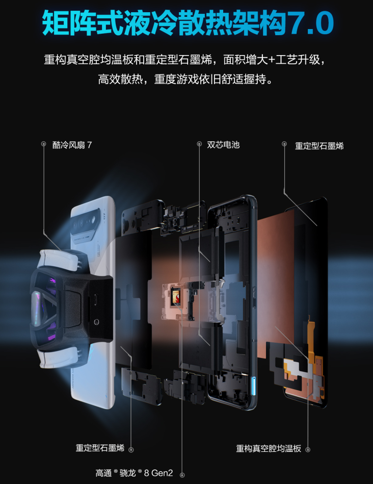 腾讯ROG游戏手机7 Pro则采用了矩阵式液冷散热架构7.0 Plus,新增酷冷风洞系统,于机身背面左侧中间位置搭载了业内首创的酷冷风洞动设计,其由50多个精密零件构成,所采用的高扭力步进式马达内置防跌落机制,可避免碰损内部结构,提升使用寿命。酷冷风动阀将在连接酷冷风扇7后自动打开,将冷却气流直接带至鳍片式微型真空腔均温板,通过冷风对流对SoC实现快速降温。