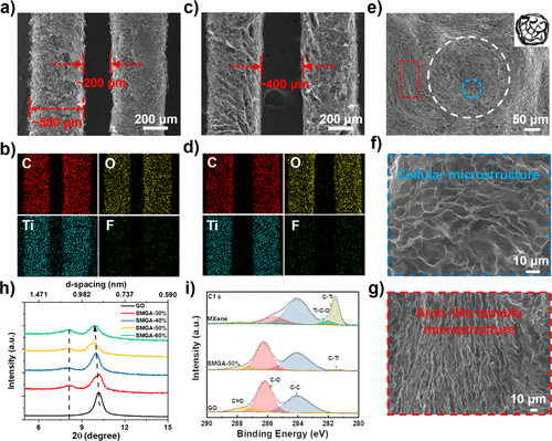 3d打印SMGA-50%的形貌和化学结构。(a, c)打印细丝宽度和相邻细丝间隙距离的SEM图像,(b, d) c, O, Ti, f对应的EDS图。(e)截面视图的SEM图像。(f, g)细丝的放大SEM图像。(h)不同MXene含量的纯氧化石墨烯和SMGAs的XRD图谱。(i)纯氧化石墨烯、MXene和SMGA-50%的c1s光谱。