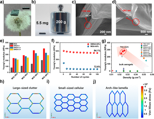 3d打印SMGAs的力学性能。(a)轻量化和(b) SMGA-60%-0.4的高刚度特性。不同细胞壁厚度的3d打印(c) SMGA-30%和(d) SMGA-60%的SEM图像。(e)不同间隙的MGAs和3d打印SMGAs的杨氏模量。(f) 100次压缩循环时,压缩应力为10 KPa时MGA-60%和SMGA-60%的杨氏模量。(g) 3d打印SMGAs的杨氏模量远远超过大多数具有相当几何密度的传统体积mxene气凝胶。COMSOL多物理场模拟(h) MGAs大尺寸杂波微观结构和(i, j) SMGAs分层多孔微观结构的应力分布。