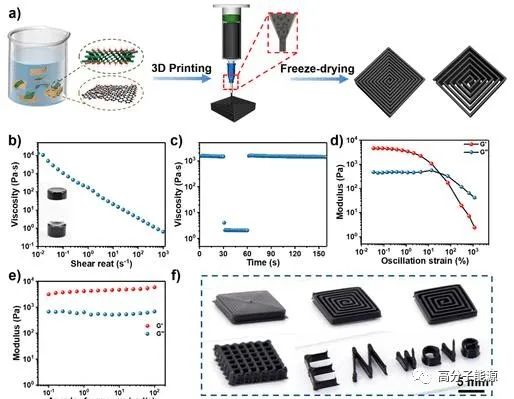 基于微晶结构的SMGAs 3D打印制造策略示意图及基于mxene油墨的流变性能。(a) SMGAs的制备示意图。(b) mxene基油墨的表观粘度随剪切速率的函数;插入的光学照片显示了纳米复合油墨的凝胶状态。(c)模拟基于挤压的3D打印过程中油墨粘度的变化。(d)存储模量(G′)和损耗模量(G″)与复合油墨振荡应变的关系,(e)与剪切频率的关系。(f)使用基于mxene的油墨的各种3d打印架构的光学图像。