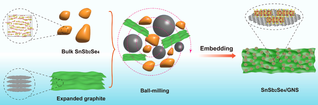 图1. SnSb2Se4/GNS复合物的合成示意图。