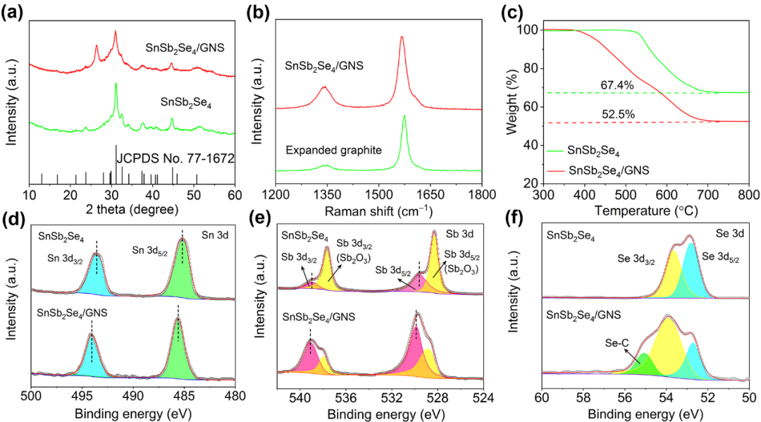 图3. SnSb2Se4和SnSb2Se4/GNS的(a) XRD图谱,(b) 拉曼光谱,(c) TGA曲线。SnSb2Se4和SnSb2Se4/GNS的(d) Sn 3d,(e) Sb 3d,(f) Se 3d XPS光谱。