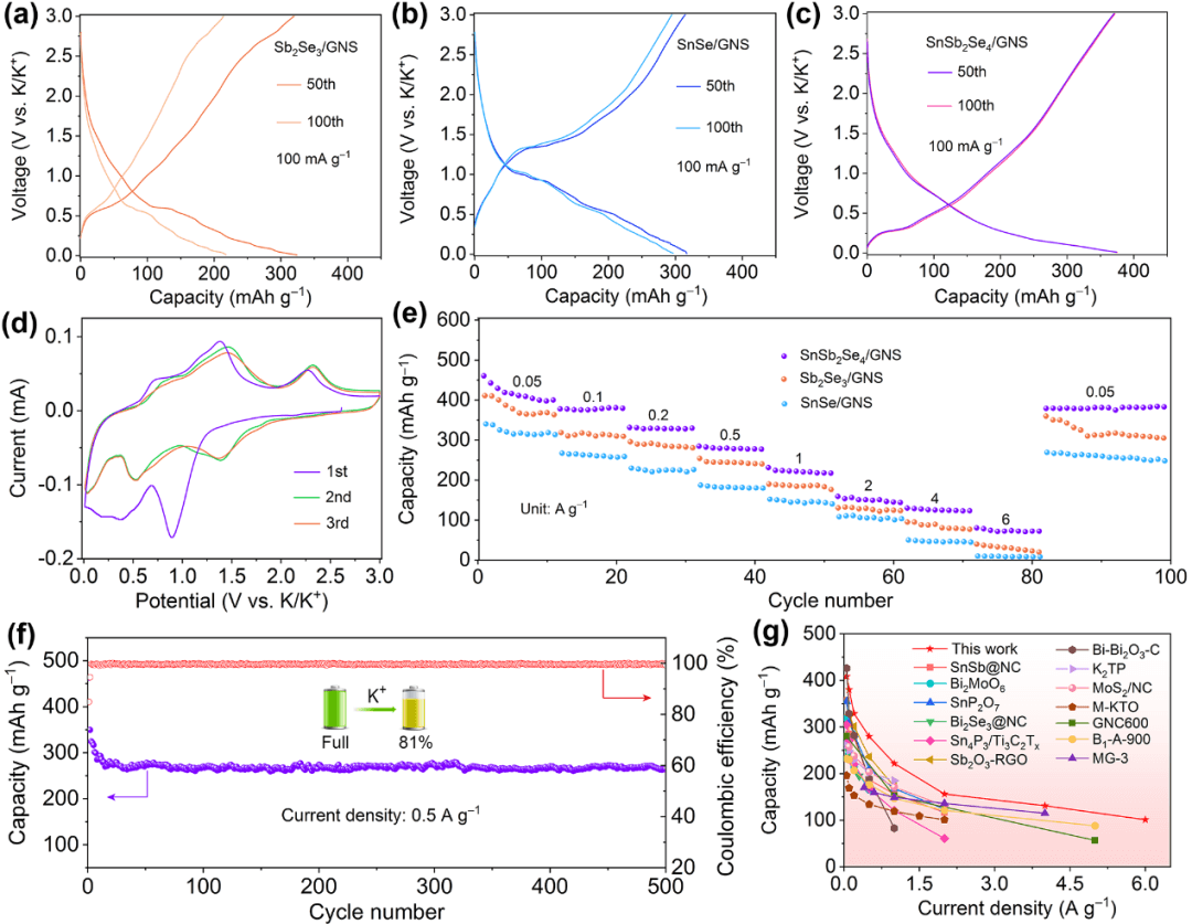 图4. (a) Sb2Se3/GNS,(b) SnSe/GNS和(c) SnSb2Se4/GNS在100 mA g−1时的充放电曲线,(d) 在0.1 mV s−1 的扫速下,SnSb2Se4/GNS的CV曲线。(e) Sb2Se3/GNS,SnSe/GNS和SnSb2Se4/GNS的倍率性能和(f) SnSb2Se4/GNS在0.5 A g−1下的长循环性能。(g) SnSb2Se4/GNS与其它钾离子电池负极的倍率性能比较。