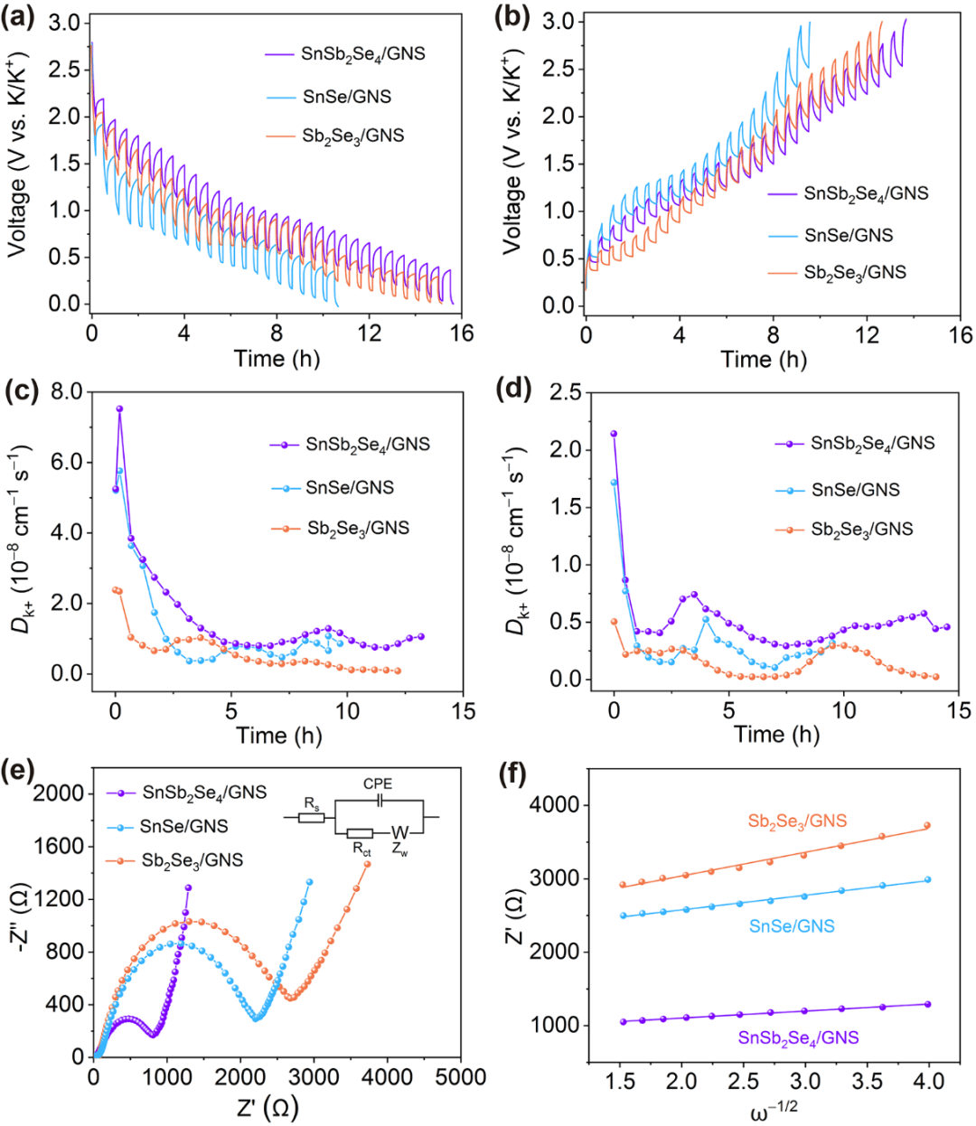 图5. SnSb2Se4/GNS、SnSe/GNS和Sb2Se3/GNS的GITT曲线,(a)第五次循环的放电和(b)第五个循环的充电。SnSb2Se4/GNS、SnSe/GNS和Sb2Se3/GNS在放电时(c)和充电时(d)的扩散系数。(e) SnSb2Se4/GNS、SnSe/GNS和Sb2Se3/GNS电极在5个周期后的Nyquist图。(f) 通过对SnSb2Se4/GNS、SnSe/GNS和Sb2Se3/GNS的Z’(即Zre)与ω−1/2图的线性拟合,得到了Warburg阻抗系数(σw)。