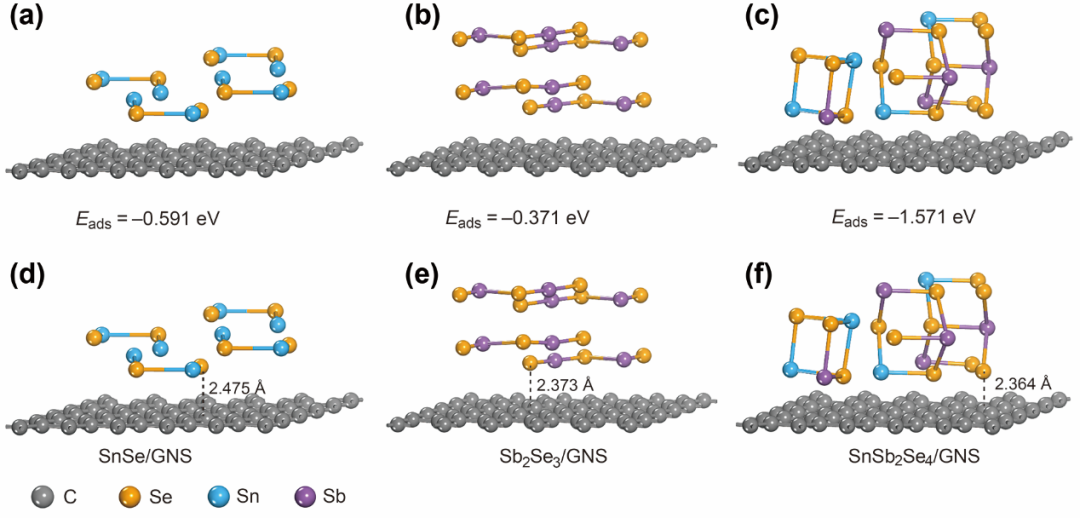 图6. (a) SnSe/GNS,(b) Sb2Se3/GNS和(c) SnSb2Se4/GNS的吸附能。(d) SnSe和GNS之间的距离,(e) Sb2Se3和GNS的距离,以及(f) SnSb2Se4和GNS的距离。