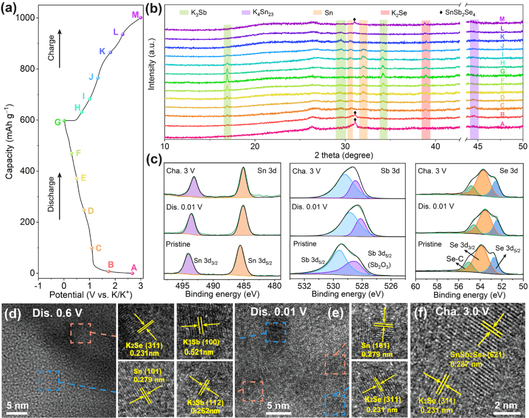 图7. (a) 在100 mA g−1时的放/充电曲线和(b) 在第一次循环中,不同状态下的SnSb2Se4/GNS的非原位XRD图。SnSb2Se4/GNS电极在不同状态下的XPS光谱:(c) Sn 3d, Sb 3d和Se 3d。SnSb2Se4/GNS在不同状态下的HRTEM图像:(d) 初始放电到0.6 V,(e) 初始放电到0.01 V,(f) 初始充电到3.0 V。