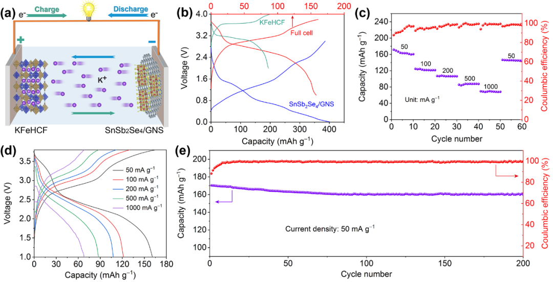 图8. (a) 全电池工作机制示意图,(b) 典型的充/放电曲线,(c) 倍率性能,(d) 不同电流密度下的充/放电曲线,(e) SnSb2Se4/GNS//KFeHCF全电池的长循环性能。