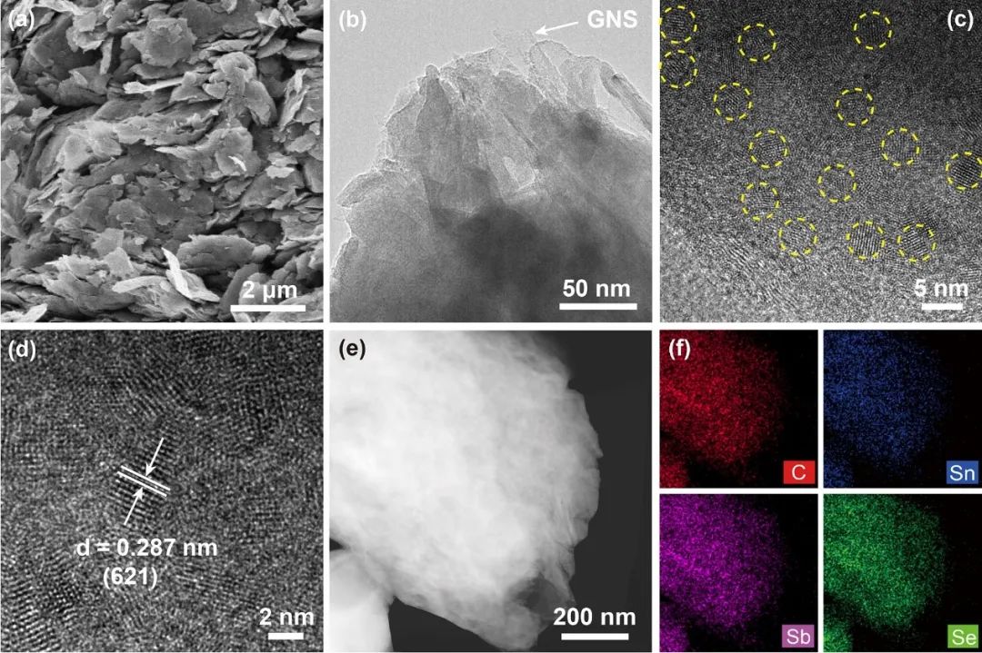 图2. (a) SnSb2Se4/GNS的SEM图,(b) SnSb2Se4/GNS的TEM图,(c,d) SnSb2Se4/GNS的HRTEM图,(e) HAADF-STEM图。(f) SnSb2Se4/GNS对应的元素映射图。