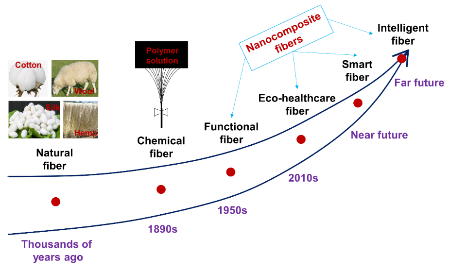 文章首先介绍了纤维的工业化发展历程(图1)。20世纪50年代,功能纤维实现工业化生产,人们开始关注纤维的附加价值。为了改善传统天然及化学纤维的力学性能和功能,纳米复合纤维应运而生。经历了近60年的发展,纳米复合纤维已具备高强度、电磁屏蔽、高导电、高导热、远红外与负离子发生、储存与释放电能、传感等诸多功能。21世纪初,新一代的生态级保健纤维——石墨烯纳米复合纤维实现工业化生产,这类纤维兼具环境无害、病菌防护、辅助理疗的特点,纳米复合纤维进入绿色可持续发展的新阶段。未来,纳米复合纤维追求集成自感知、自驱动、自修复等智能性,推进新一代智能纳米复合纤维的工业化生产和应用。