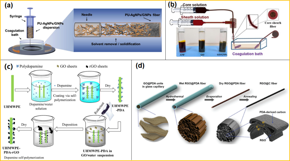 随后,围绕高分子基纳米复合纤维的六大功能——高强度、电磁屏蔽与阻燃、导电导热性、远红外/负离子发生与发电、储能、传感,探讨了各功能的设计原则、制备方法、内在机理和性能对比。目前,与高分子复合的纳米填料分为零维、一维和二维纳米材料,例如零维的金属及金属氧化物纳米颗粒、无机纳米粉、碳量子点,一维的碳纳米管、金属纳米线、导电高分子,二维的石墨烯、二硫化钼、MXene等。通过合理选择高分子基体与纳米填料,设计功能性(图2)。采用复合纺丝或后处理方法,将多种组分加工成纳米复合纤维(图3)。纤维组分的选择与纳米结构的设计,决定了纤维的性能(图4-图7)。